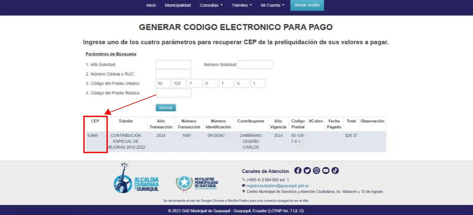 El sistema muestra automáticamente el valor a pagar por el CEM y un código CEP, el número CEP se debe utilizar para realizar el pago en línea o en las ventanillas del Municipio de Guayaquil.