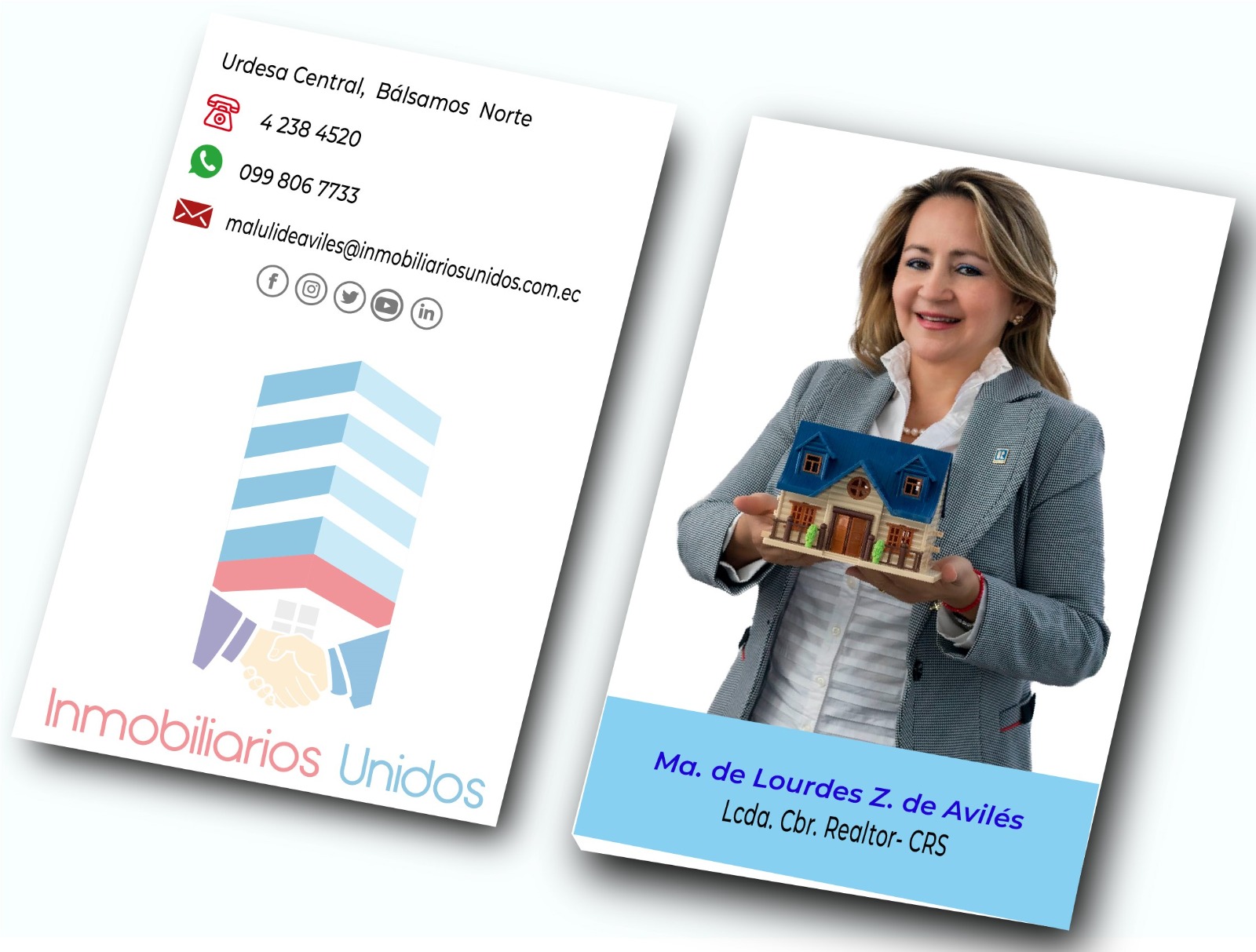 En la actualidad trabajo en Inmobiliarios Unidos, la empresa que yo mismo cree hace aproximadamente diez años. Soy Corredora Inmobiliaria-Realtor, me dedico a esta noble actividad brindando el servicio de asesoría inmobiliaria e inversiones para la comercialización compra-venta-alquiler de propiedades residenciales, comerciales, industriales, agrícolas, etc., adicionalmente complementado mis conocimientos ofrecemos el servicio de avalúos inmobiliarios, maquinaria, vehículos, mercadería, trámites municipales y arquitectónicos, marketing digital inmobiliario.